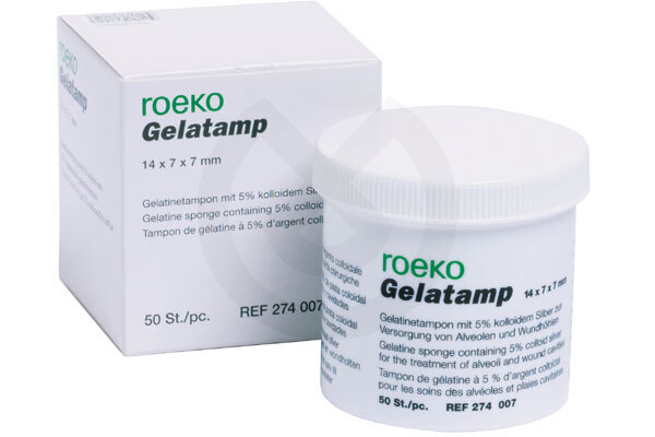 La esponja de gelatina Gelatamp con plata coloidal ofrece al dentista un producto eficiente y biocompatible para un tratamiento post-extracción de confianza. La plata coloidal tiene un efecto depósito bactericida. El bote contiene 50 tampones que pueden cortarse, si fuera necesario, para adaptarlos al alvéolo sin comprimirlos.