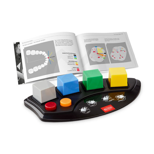 Paleta de presentación de cera con tapa transparente y manual de usuario según la filosofía de Oliver Dreher; 4 ceras de modelar de 40 g cada una: cera funcional GEO Expert gris, azul, verde, amarillo; 2x ceras de modelado de 4 g cada una: cera funcional GEO Expert roja, naranja; 2 hojas DIN A5 con brújula oclusal (24 etiquetas cada hoja)