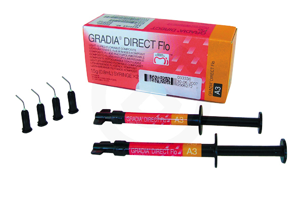 Composite híbrido fluido, fotocurable, para fondo de cavidad debajo de restauraciones con composite. Gradia Flo tiene propiedades físicas y una consistencia especialmente adaptada para usarlo como protector debajo de restauraciones y para cavidades muy pequeñas. No es pegajoso, ni extremadamente fluida, se vierte rápidamente pero no se derrama y se forma perfectamente en las paredes de la cavidad. La jeringa está especialmente diseñada para una más fácil aplicación.
