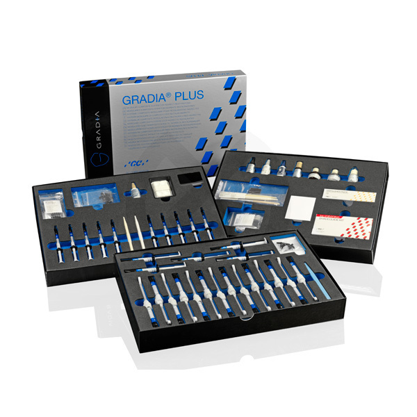 4x GRADIA PLUS Paste Heavy Body 3.3ml HB-ODC, HB-ODD, HB-ODW, HB-DW; 16x GRADIA PLUS Paste Light Body 2.0ml LB-Base E, LB-Base CLF, LB-Base D, LB-DW, LB-Base OD, LBODW, LB-Base Opal, LB-Orange, LB-Yellow, LB-Red, LB-Grey, LB-Blue, LB-Milky, LB-Inlay E, LB-Inlay TD; 10x GRADIA PLUS Mixotip; 15x GRADIA PLUS Dispensing Tip Plastic Type Wide & Light; Protective Cover; 1x Mixing Pad No. 22; 1x Plastic Spatula No. 2 Blue