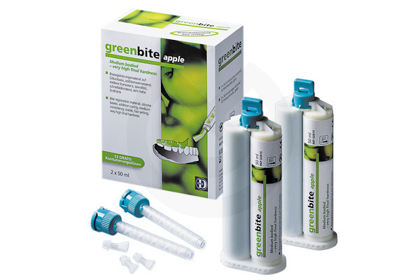 Material de registro de oclusión, a base de siliconas A, de media consistencia - fluido, tixotropo. Aplicación directa sobre la hilera de dientes, tiempo en la boca extraordinariamente breve (60 seg.), de elevada dureza final aprox. 45 Shore D, fácil de trabajar. Colores: Base verde, Catalizador amarillo ¡Con aroma de manzanas!