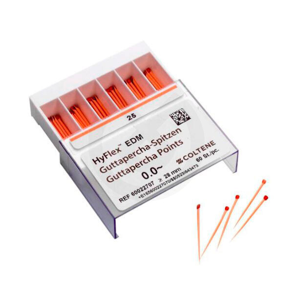 Puntas de gutapercha que se adaptan de manera óptima a las limas HyFlex EDM, obturarndo con precisión los conductos radiculares que se han preparado previamente con las limas HyFlex. Son adecuadas para las técnicas de condensación vertical, lateral y térmica, son radiopacas. No contienen látex. 28 mm de largo.
