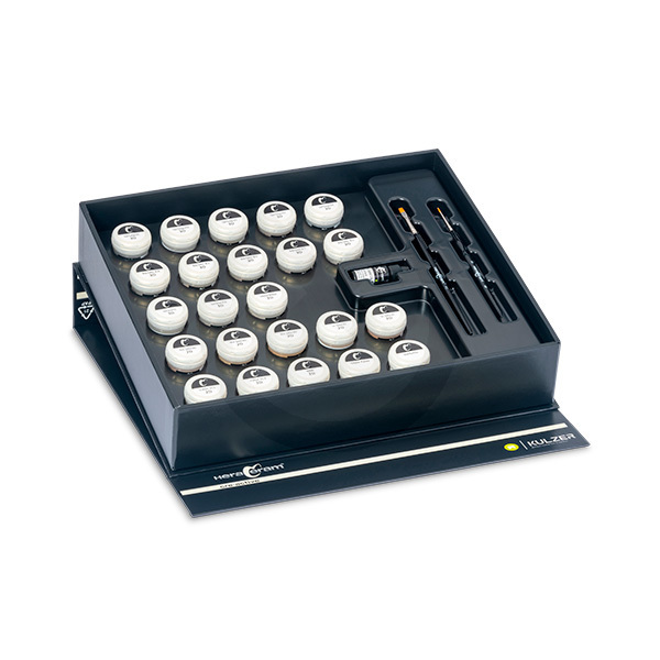 21x 2ml HeraCeram cre-active 2D and 3D pastes 2x 3ml HeraCeram cre-active Glaze pastes 1x 2ml HeraCeram cre-active Liquid CAL 2x Brushes; 1x Shade Guide