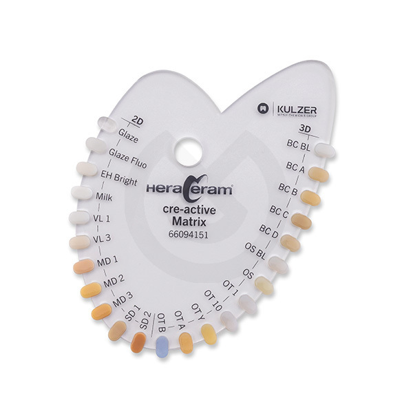 La Guía de Colores Matrix Set está pensada para los técnicos que trabajan con el set más completo de HeraCeram cre-active. Ofrece una visualización precisa de la amplia gama de pastas 2D y 3D incluidas en el Matrix Set, facilitando la elección del tono ideal.