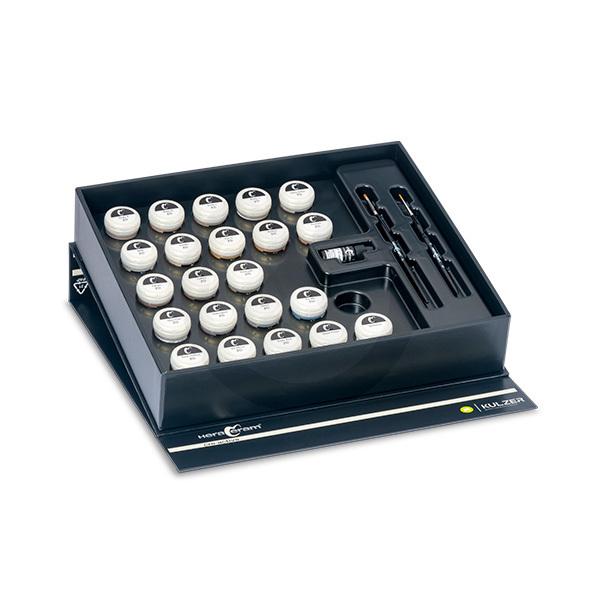 19x 2ml HeraCeram cre-active 2D and 3D pastes 2x 3ml HeraCeram cre-active Glaze pastes 1x 3g HeraCeram cre-active 2D powder 1x 2ml HeraCeram cre-active Liquid CAL 2x Brushes; 1x Shade Guide