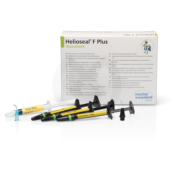 Helioseal F Plus es un sellador de fisuras fotopolimerizable, en color blanco y con liberación de flúor. Helioseal F Plus tiene óptimas propiedades de fluidez y es fácil de distribuir en superficies intrincadas, incluso en el maxilar superior. El sellado marginal hermético que se produce brinda protección contra las bacterias cariogénicas. Indicado para el sellado de fisuras, fosas y diminutas cavidades. Consistencia optimizada, tiempo de exposición reducido y excelente retención. Tratamiento cómodo y rápido para niños.