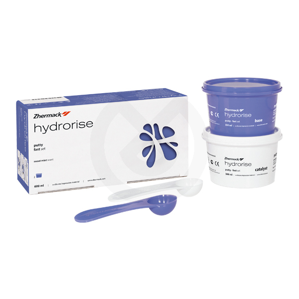 'Nueva gama de siliconas de adición, desarrollada por el departamento de I+D Zhermack, que garantiza un resultado clínico en la toma de impresiones muy superior al de los polivinilsiloxanos convencionales: Tecnología Hiper-hidrocompatible, con un Ángulo de contacto inferior a 10º y una extremada afinidad con los fluidos orales, que le permite adaptarse perfectamente a cualquier morfología dental. Sistema AMDA (Advanced Moisture Displacement Action) que consiste desplazar los fluidos orales del surco gingival y reproducir con la máxima precisión los márgenes de la impresión. Hydrosystem, reductor de la tensión superficial que aplicado antes de la toma de impresión con las siliconas Hydrorise, acondiciona la superficie de la preparación y mejora el resultado clínico, reduciendo el riesgo de repeticiones. La línea Hydrorise también está disponible en cartuchos 5:1, diseñados y patentados por Zhermack, para máquinas de mezcla automática, (los cartuchos 5:1 son compatibles con las máquinas de mezcla habituales existentes en el mercado). Toda la gama de siliconas Hydrorise está disponible en: Fraguado Normal: tiempo de trabajo 1; toma en boca 3'30 Fraguado Rápido: tiempo de trabajo 1 30; toma en boca 2'30 para ofrecer la máxima flexibilidad y comodidad en la práctica clínica, adaptándose a las necesidades de cada usuario.'