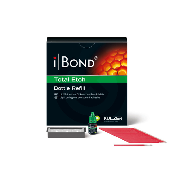 Ibond Total Etch es un adhesivo de 5ª generación (2 pasos en 1 bote) de Heraeus Kulzer con una fórmula mejorada. Es un adhesivo fotopolimerizable para uso en terapias de adhesión de composites: - Adhesión de restauraciones directas de composite - Adhesión de restauraciones indirectas - Sellado de áreas dentarias hipersensibles Con Ibond Total Etch, en tan sólo un único paso se aplica primer, bonding y desensibilizante. Es adecuado en combinación de Ácidos al 20% y 35% indistintamente. - Sencillez de manejo: aplicación de una sola capa, extender y secar con aire, no precisa ser agitado. - Excelentes resultados: sistema basado en nano-partículas proveen a iBOND Total Etch de los mejores resultados posibles en adhesión junto con una magnífica integridad marginal. - Efecto desensibilizador: penetra profundamente en los túbulos dentinarios y previene el dolor.