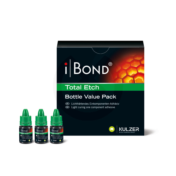 Ibond Total Etch es un adhesivo de 5ª generación (2 pasos en 1 bote) de Heraeus Kulzer con una fórmula mejorada. Es un adhesivo fotopolimerizable para uso en terapias de adhesión de composites: - Adhesión de restauraciones directas de composite - Adhesión de restauraciones indirectas - Sellado de áreas dentarias hipersensibles Con Ibond Total Etch, en tan sólo un único paso se aplica primer, bonding y desensibilizante. Es adecuado en combinación de Ácidos al 20% y 35% indistintamente. - Sencillez de manejo: aplicación de una sola capa, extender y secar con aire, no precisa ser agitado. - Excelentes resultados: sistema basado en nano-partículas proveen a iBOND Total Etch de los mejores resultados posibles en adhesión junto con una magnífica integridad marginal. - Efecto desensibilizador: penetra profundamente en los túbulos dentinarios y previene el dolor.