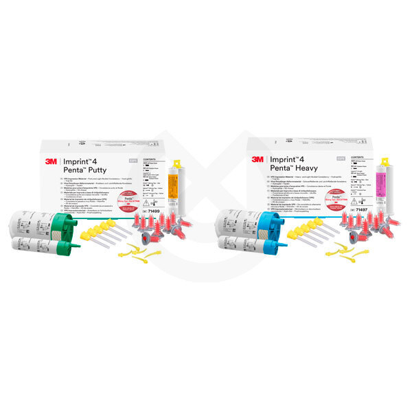 1 unidad de 300 ml (Base) + 1 unidad de 60 ml (Catalizador) de Imprint 4 Penta + 1 cartucho de 50 ml + 10 puntas rojas Penta + 5 puntas de mezcla amarillas + 5 puntas intraorales