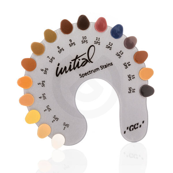 GC Initial Spectrum Stains es un maquillaje y glaseado universal para el maquillado y caracterización individualizada de los materiales cerámicos a nivel externo y la individualización interna de capas de cerámica. De un amplio rango de CTE (Coeficiente de Temperatura) son perfectamente compatibles con casi todos los tipos de cerámicas dentales.