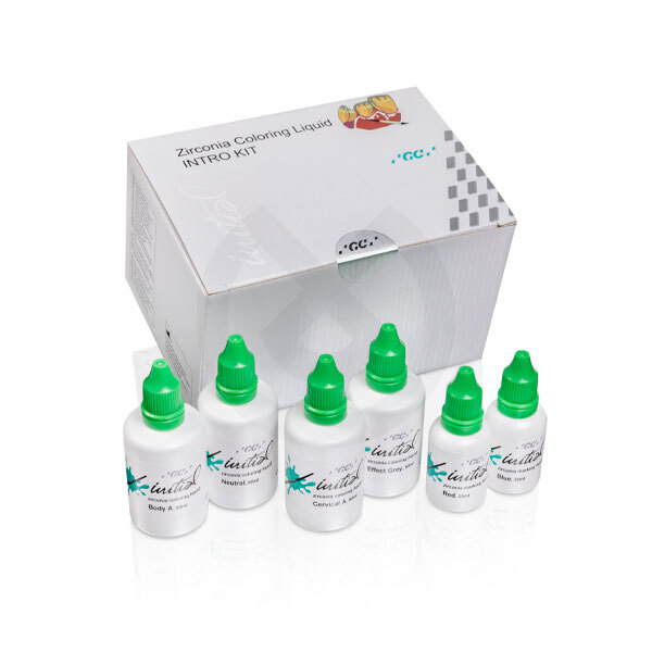 Contiene: GC Initial Zr Coloring Liquid: • 1x Body A, 50ml • 1x Cervical A, 50ml • 1x Effect Grey, 50ml • 1x Neutral, 50ml GC Initial Zirconia Marking Liquid: • 1x Red, 25ml • 1x Blue, 25ml Short IFU