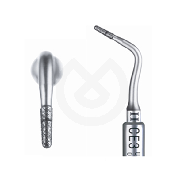 - Utilizado perpendicularmente o paralelamente al hueso, este insert está destinado a las osteotomías del hueso de apoyo en zonas interproximales, perirradiculares y palatinas.