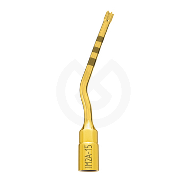 Acción cortante para alargar la osteotomía piloto. Aplicación clínica para finalizar la preparación del lecho del implante con irrigación doble para evitar el sobrecalentamiento (en el maxilar). 2 mm de diámetro. Para zonas anteriores de 15 mm de profundidad.