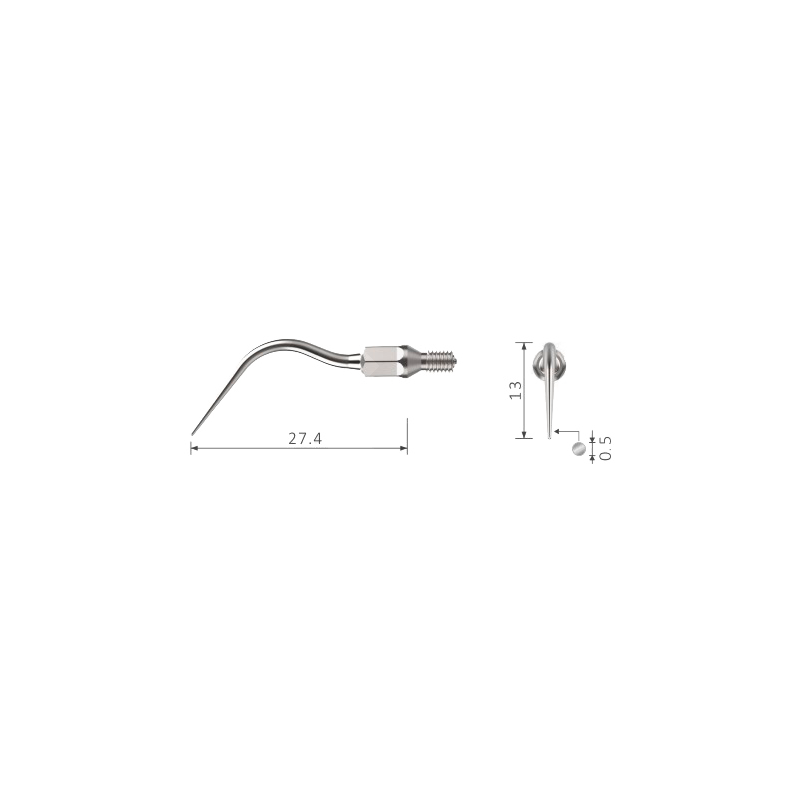 Una punta larga y recta con superficies redondeadas, la k#60 se utiliza para la limpieza suave de las bolsas durante el tratamiento periodontal. Es eficaz en la limpieza de bolsas de hasta 9 mm de profundidad. Se utiliza en la región anterior, superficies lisas.