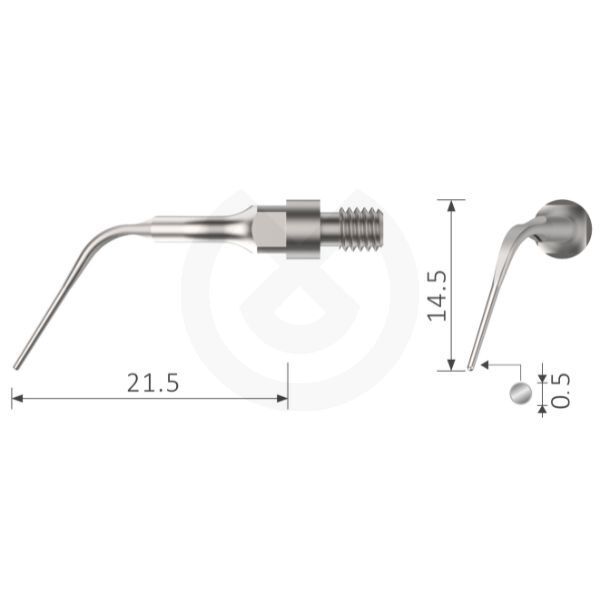 Punta curvada hacia la derecha que podrás usar para la limpieza de raíces en bolsas periodontales profundas en la región posterior.