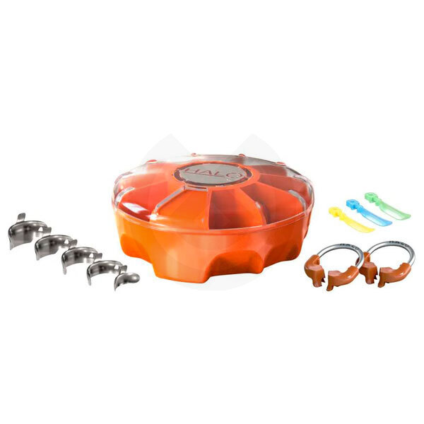 El sistema de matrices seccionales Halo incluye anillos de nitinol, bandas de matriz de acero inoxidable ultrafinas de 0,038 mm (Original y Firm) y cuñas fáciles de colocar. El dispensador de carrusel le permite seleccionar fácilmente el componente que necesita, mantiene su sistema Halo organizado y ayuda a evitar derrames accidentales. Cada pieza del sistema Halo está diseñada para trabajar en conjunto para crear restauraciones de composite consistentes y de contorno natural en menos tiempo.