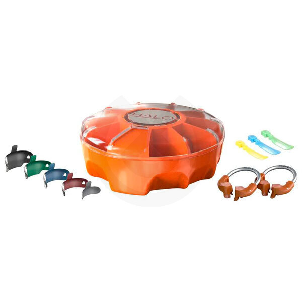 El sistema de matrices seccionales Halo incluye anillos de nitinol, bandas de matriz de acero inoxidable ultrafinas de 0,038 mm (Original y Firm) y cuñas fáciles de colocar. El dispensador de carrusel le permite seleccionar fácilmente el componente que necesita, mantiene su sistema Halo organizado y ayuda a evitar derrames accidentales. Cada pieza del sistema Halo está diseñada para trabajar en conjunto para crear restauraciones de composite consistentes y de contorno natural en menos tiempo.