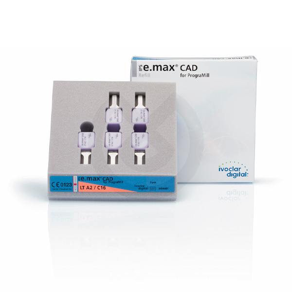 Baja translucidez IPS E.max CAD es la cerámica vítrea de disilicato de litio versátil y fiable para aplicaciones CAD/CAM en el laboratorio y la práctica dental. Está indicada para restauraciones de un solo diente y puentes de 3 unidades (región premolar). Su expresiva estética y su alta resistencia, además de la sólida evidencia clínica, permiten la fabricación de restauraciones fuertes y estéticas. Después del proceso en húmedo en una máquina PrograMill, las restauraciones se cristalizan. Posteriormente, se pulen, se caracterizan con maquillajes o se revisten con materiales de estratificación.