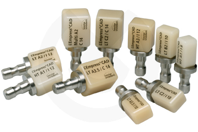 Bloques LT: Por su cromatismo y brillo, por su traslucidez menor, son perfectos para la fabricación de restauraciones de mayor tamaño (p. ej., coronas parciales, coronas).
