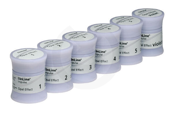 Se puede elegir entre cinco diferentes gradaciones de color. El Effect 1 permite aportar una opalescencia natural a la restauración junto con una elevada translucidez. El value del material se va incrementando gradualmente desde el Effect 2 al 5. En contraste, el material violeta reduce el value del area incisal.