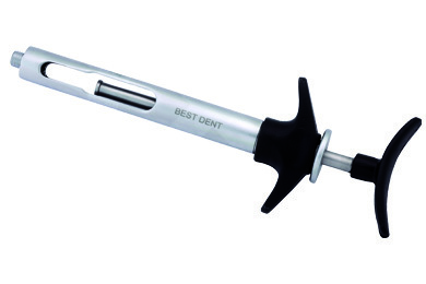 Jeringa de aspiración automática. Fabricada en acero inoxidable y plástico de color negro.