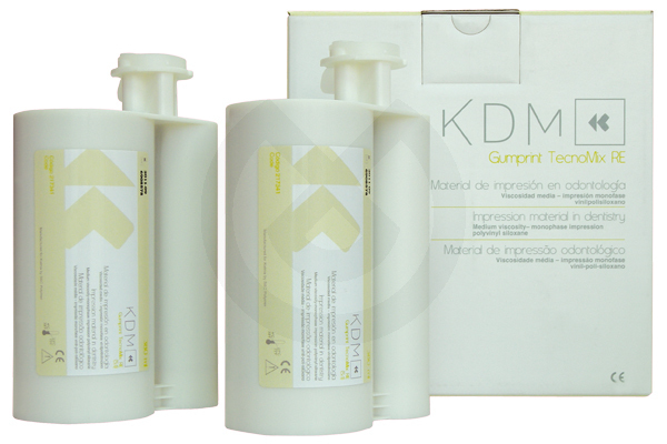 Material de impresión viscoso de alta hidrofilia y rápido fraguado consistente en siliconas de adición de vinilpolisilaxano. Para todas las técnicas de toma de impresión: doble impresión, impresiones de dos viscosidades en una sola fase, coronas, puentes, incrustaciones, impresiones funcionales. Mono impresión, implatología, impresiones edentulares, rebases, transferencia de espigas radiculares, cubetas individuales. KDM GUMPRINT TECKNOMIX RE muestra propiedades de alta hidrofilia y es compartible con superficies húmedas. Así pues, esta produce una reproducción exacta de las áreas subgingivales y otras superficies húmedas. Se suministra en cartuchos de 380 ml. Los cartuchos se pueden utilizar con máquinas de mezcla compatibles de proporción 5:1.