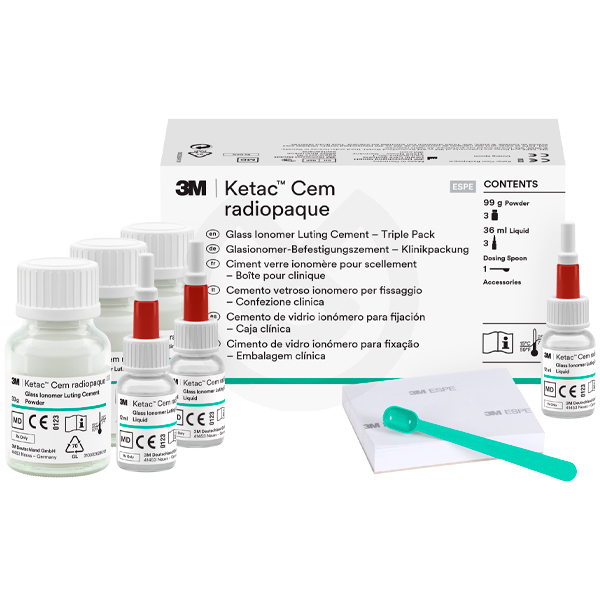 Ketac Cem es un cemento definitivo de ionómero de vidrio que ofrece liberación de flúor, óptima adaptación e integridad marginal para cementación de coronas, puentes, inlays, postes endodónticos, tornillo, bandas ortodónticas y recubrimiento cavitario, su formulación granulada ofrece propiedades excelentes para su mezcla así como la reducción de desperdicio.