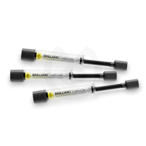Brilliant EverGlow es un composite híbrido submicrónico de uso universal con muy fácil y sobresaliente pulido y excelente estabilidad del brillo y color, ideal para el sector anterior y buen rendimiento en posteriores. Disponibles opcionalmente tonalidades opacas y translúcidas para estratificar.