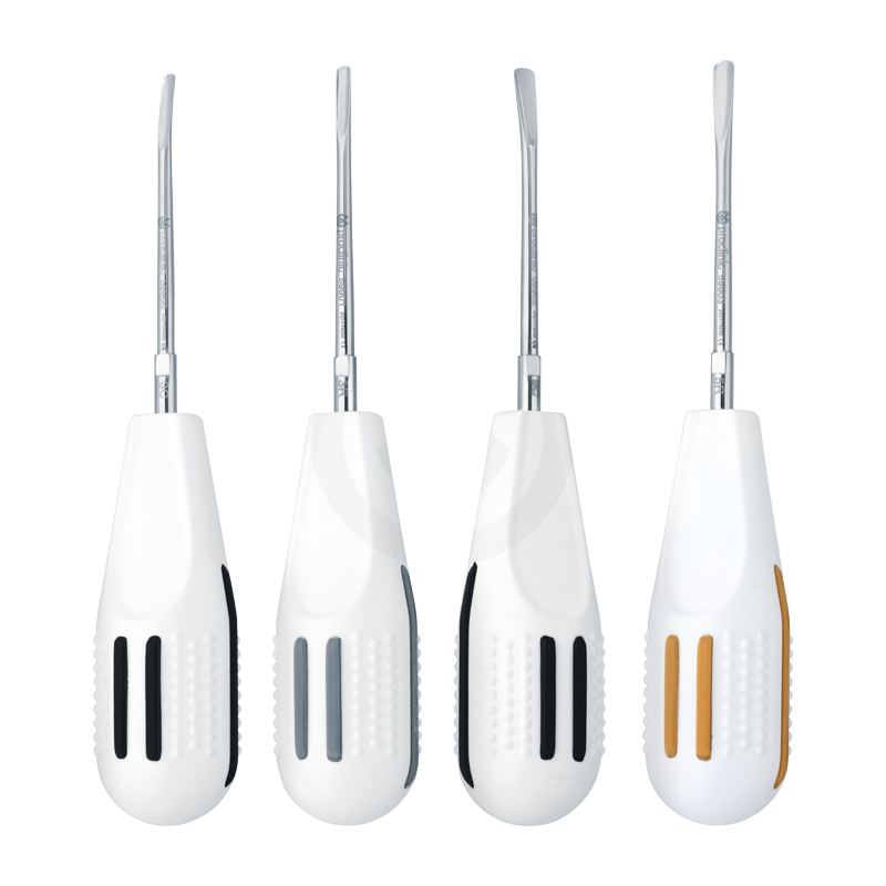 Instrumentos diseñados para cortar ligamentos con una fina hoja que comprime el alveolo, corta la membrana y facilita la extracción, con el menor trauma. Similares a los elevadores pero con puntas mucho más afiladas integran la función de periostótomo y botador en un solo instrumento. Ideales para piezas fracturadas y raíces cariadas. El kit de esta compuesto por 4 instrumentos.