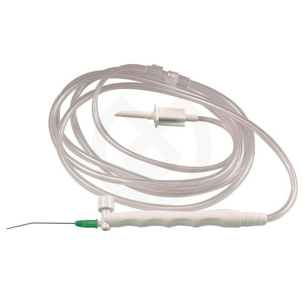 Sistema de irrigación externa que se utiliza en casos donde no se disponga de una bomba peristáltica o cuando sea necesaria una irrigación complementaria. Este sistema manual con regulador de flujo manual permite al asistente mantener el campo operatorio limpio y refrigerado. El sistema también es idóneo para irrigar en la fase final del proceso mediante una llave dinamométrica. Longitud 220 cm. Estéril.