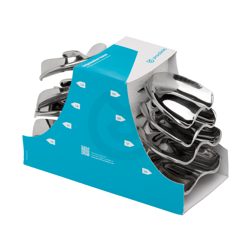 Estuche con 8 cubetas para la toma de impresiones en pacientes desdentados. Fabricadas en acero inoxidable, sin perforar y con reborde. Contiene 4 cubetas superiores y 4 cubetas inferiores. Tamaños: U6, U7, U8, U9 y L6, L7, L8, L9.