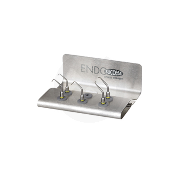Kit EndoSuccess Apical Surgery (Ref. F00069): 5 insertos: AS3D, AS6D, AS9D, ASRD y ASLD, 1 caja soporte inox y 1 llave esterilizable.