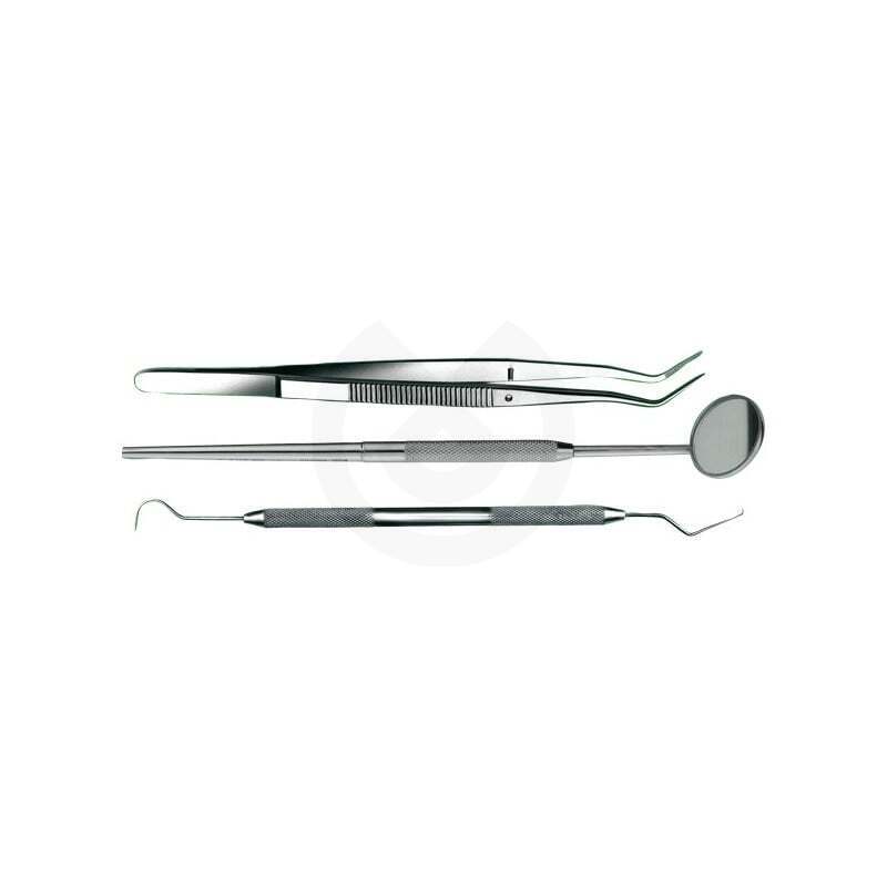 El kit contiene 1 espejo plano n.4 con mango, 1 sonda doble y 1 pinza Meriam.