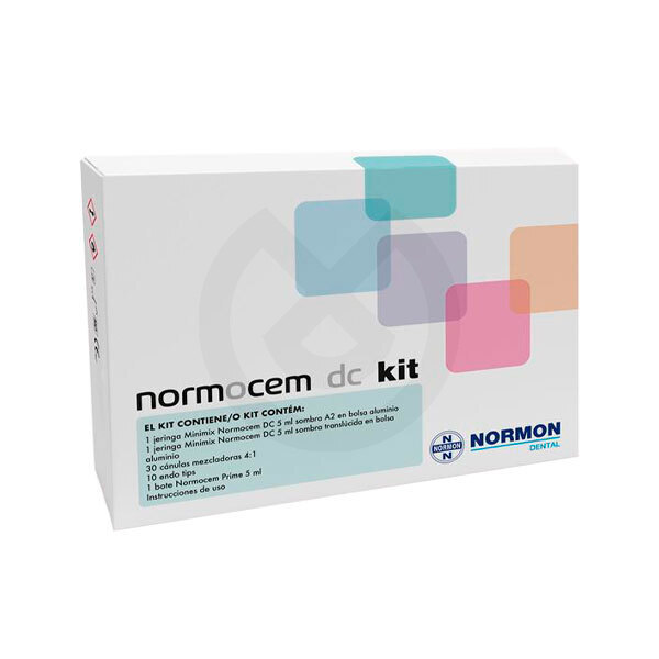 2 jeringas automix Normocem DC de 5 ml (translucido y A2) + 30 puntas mezcladoras 4:1 + 10 puntas intraorales + 1 bote de Normocem Prime de 5 ml