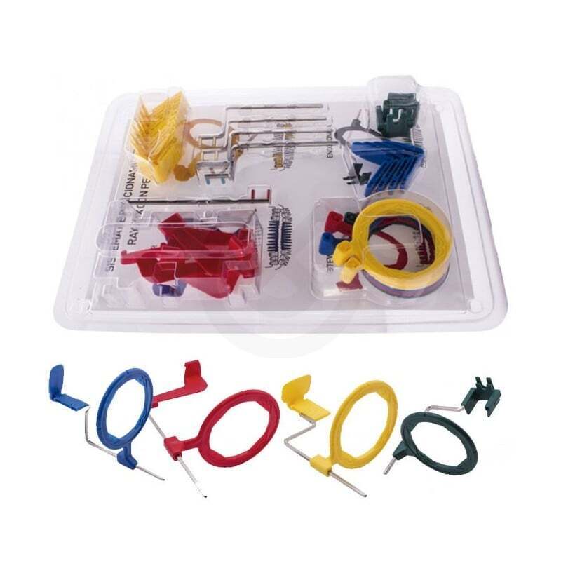 5 anillos (1 Anterior, 2 Posterior, 1 Bitewing, 1 Endodoncia) + 5 brazos indicadores (1 Anterior, 2 Posterior, 1 Bitewing, 1 Endodoncia) + 19 bloques de mordida (4 Anterior, 8 Posterior, 5 Bitewing, 2 Endodoncia).