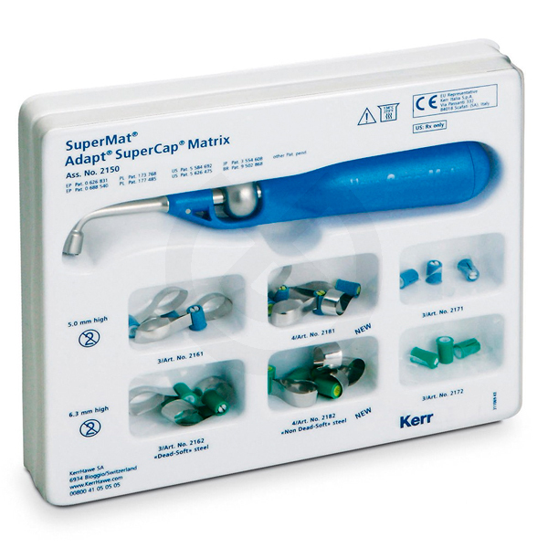 El sistema de tensado de matrices universal SuperMat™, es ideal para matrices posteriores de acero o transparentes. El objetivo del sistema es ofrecer una colocación rápida, sencilla y estandarizada. Sus matrices de anillo Adapt SuperCap se adaptan bien a la anatomía de los dientes.