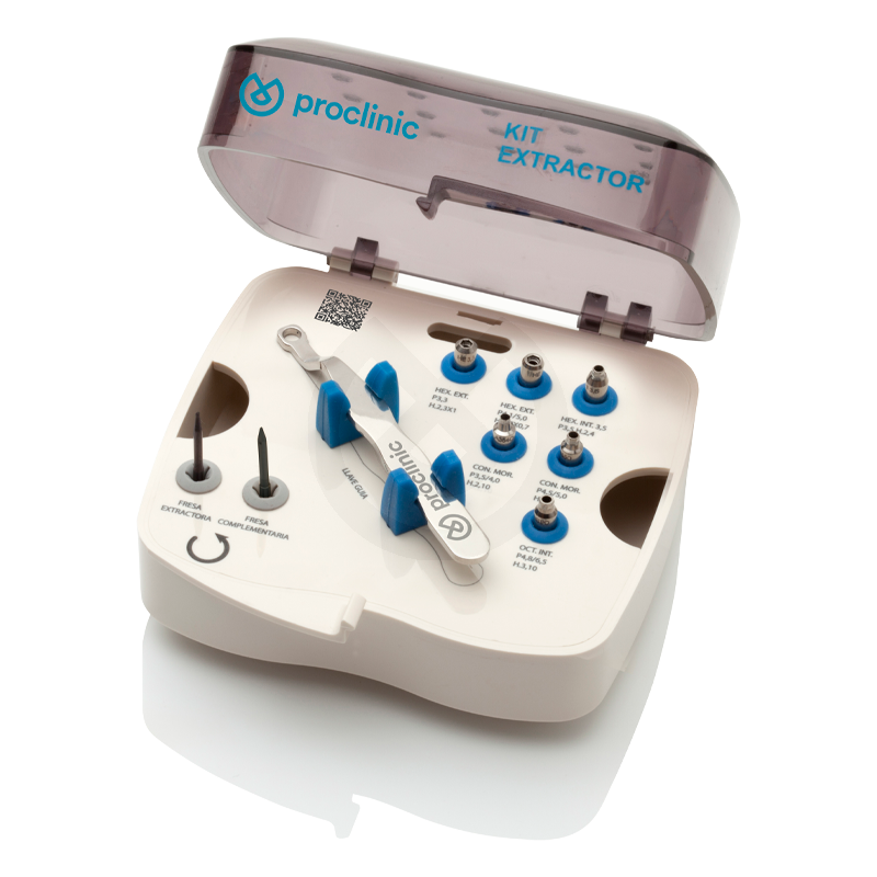 El Kit Extractor Proclinic de Tornillos ha sido diseñado para ayudar a la retirada del fragmento fracturado del tornillo dentro del implante. El éxito del proceso está condicionado a la operativa de uso de estos instrumentos por parte del profesional y de las condiciones iniciales del tornillo a retirar.