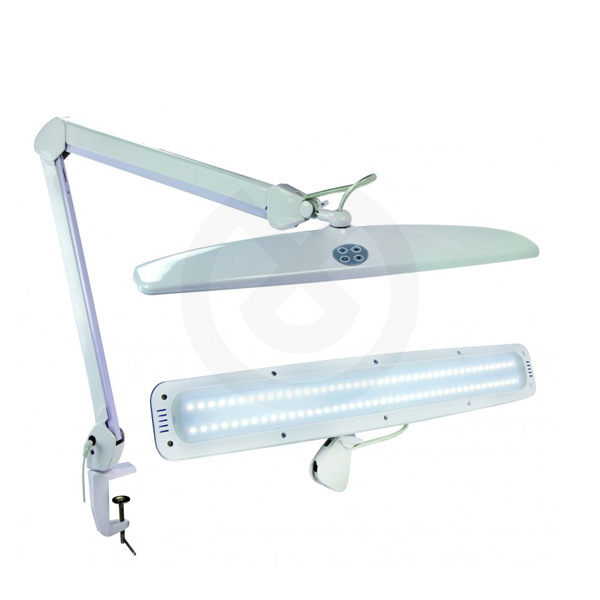 Lámpara de 84 Leds con intensidad de luz regulable de 6000-7000K. Adaptador con pinza para sujeción a la mesa. Consumo de 2-21W con vida útil 50.000 horas, luminancia de 1200 Lumen y un voltaje de 24v.