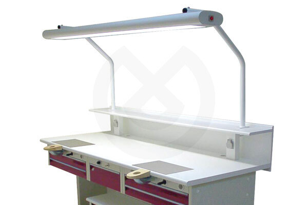 2 puestos. Lámpara con carcasa de aluminio, reflector pulido con dos tubos de 58w interruptor incorporado, dos soportes para atornillar a la encimera. Color blanco. Dimensiones: 88x165x40. Adaptable mesa modelo Elite.