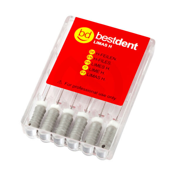 Limas manuales tipo H. Su forma en espiral les permite limpiar de detritus los canales radiculares antes de su obturación. Disponen de mango de plástico y tope de goma. Código de colores ISO para facilitar su identificación.