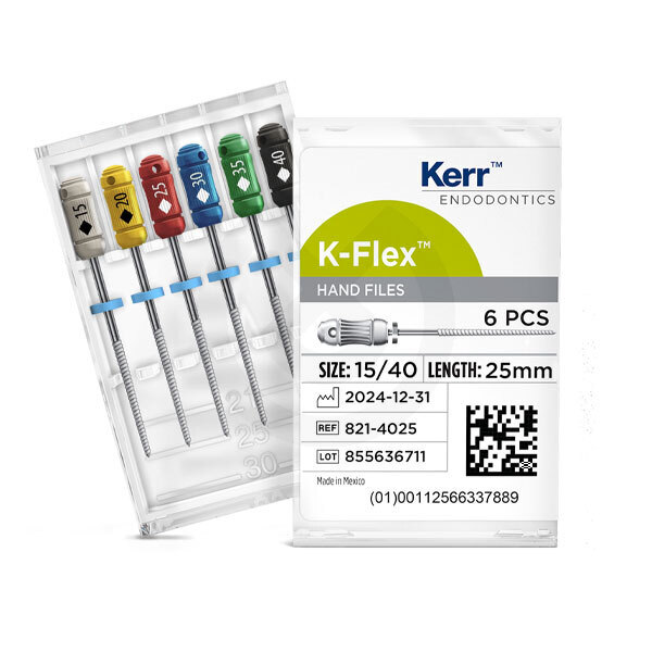 Las limas K-Flex® presentan un exclusivo diseño romboide con un eje corto que proporciona flexibilidad a la vez que mantiene la resistencia transversal. K-Flex es más flexible que las limas 'K' convencionales, principalmente en los tamaños nº 30 y superiores, lo cual facilita el tratamiento de canales curvos y su preparación con mínimas posibilidades de formación de escalones o perforaciones.