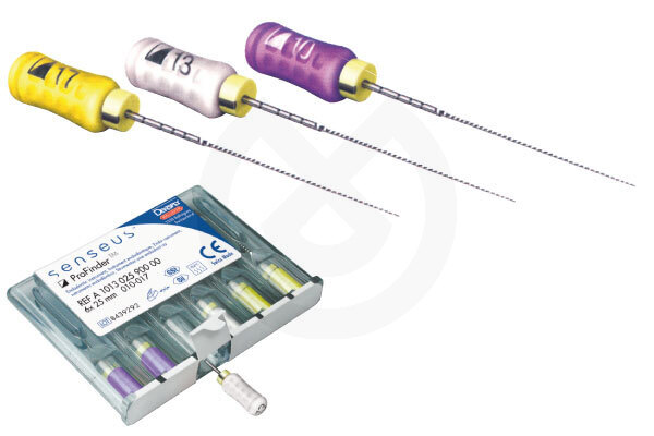 Profinder Senseus. Surtido 25 mm. Limas de cateterismo con múltiples conicidades. Estas limas de conicidad mínima y variable proporcionan capacidad de permeabilización del conducto radicular hasta hora incomparables: Más fácil establecer una continuidad y suavidad del conducto. Acometida más rápida y eficaz de conductos calcificado. Entrada más fácil del conducto. Mejor sensación táctil. Sección cuadrada con conicidad aumentada en la zona de la punta: resistencia aumentada a la torsión. Conicidad mínima detrás de la zona de la punta: instrumento de alta flexibilidad. Mango de silicona amplio y ergonómico. Anillos de calibrado visibles en radiografías. Punta no cortante de 65º con final redondeado.