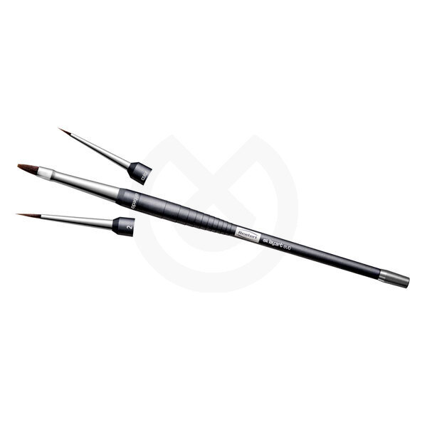 Pincel de pelo sintético. lay:art evo es un moderno pincel para cerámica con fibras biónicas. La composición química de los filamentos de fibra y su procesamiento único permiten que el pelo absorba la humedad e imite la forma de llama conocida de los pinceles de gama alta. Ambos factores representan la gestión de humedad característica que hasta ahora hacía que solo los pinceles de pelo natural fueran tan únicos. De este modo, el lay:art evo fascina por el gusto por el detalle en aspectos protésico dentales y por su pragmática funcionalidad.