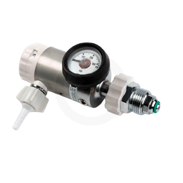 El aparato regulador es un manorreductor compacto para oxígeno que incorpora un caudalímetro de pasos. Se puede acoplar a todos los formato de botella homologados e incorpora un manómetro para medir la presión de la misma.
