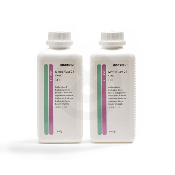 Silicona de duplicado pura, sin tintes ni material de relleno, cristalina. Su rápida capacidad de reposición y la gran resistencia a la tracción aseguran una reproducción absolutamente exacta de sus modelos. La transparencia de la silicona 1:1 (Cast A + Cast B) previene la formación de burbujas; por lo tanto, los materiales fotopolimerizables pueden trabajarse con total seguridad.