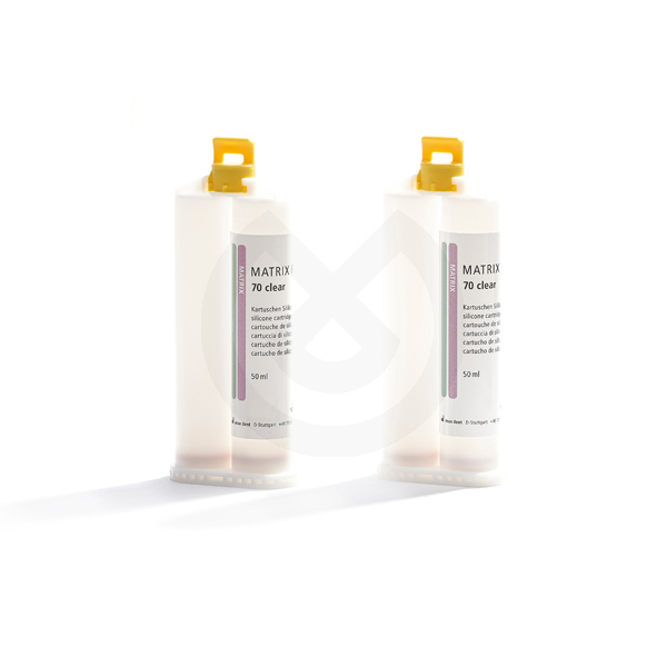 Silicona transparente por poliadición con un sistema práctico de cartuchos. La dureza Shore de 70 es ideal para la aplicación de un wax-up directamente en boca. Su fácil manipulación, fluidez y estabilidad la convierten en una silicona ideal para fabricar matrices de manera sencilla y rápida de polimerizar.