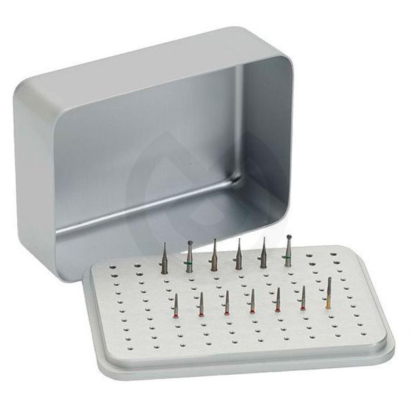 Fresero fabricado en aluminio anodizado. Dispone de 100 agujeros: 80 agujeros para fresas F.G. y 20 agujeros para fresas C.A.