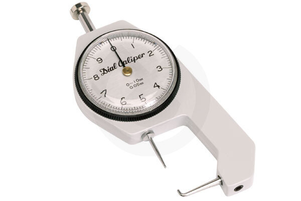 Instrumento de precisión para la medida del espesor de coronas. Amplio dial de fácil lectura y resolución en centésimas de mm. Se suministra con un práctico estuche.