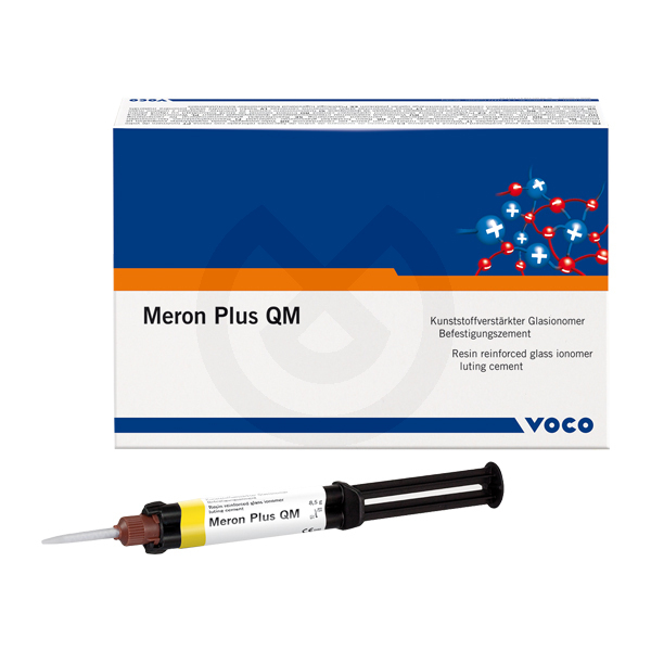 Meron Plus QM es un cemento de fijación de ionómero de vidrio radiopaco, de autocurado a base de resina modificada que está disponible en fórmula pasta/pasta en la práctica jeringa QuickMix para una aplicación rápida y simple. Meron Plus QM ofrece de forma opcional una remoción de excedentes después de la fotopolimerización.